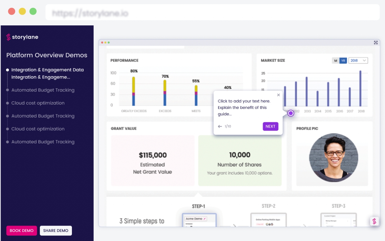 Lead Prospects Step-by-Step: Create a guided journey for your prospects by organizing demos into a customized sequence that walks them through the key points of your product.