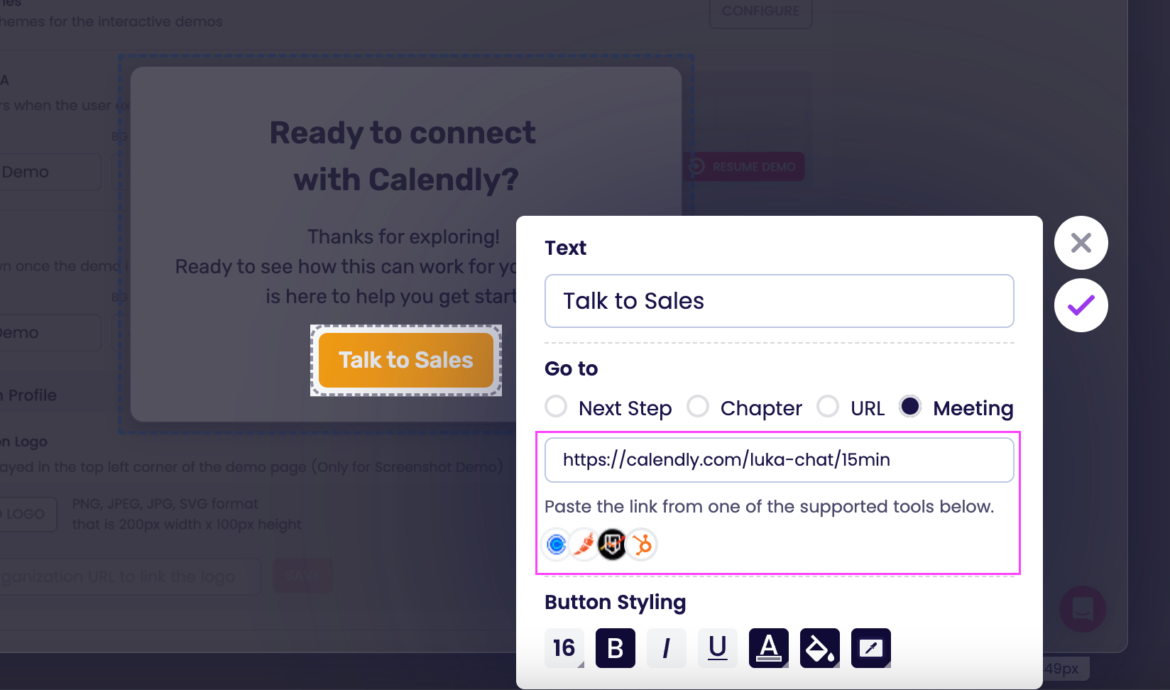 Embed live Calendly scheduling links directly into your interactive demos
