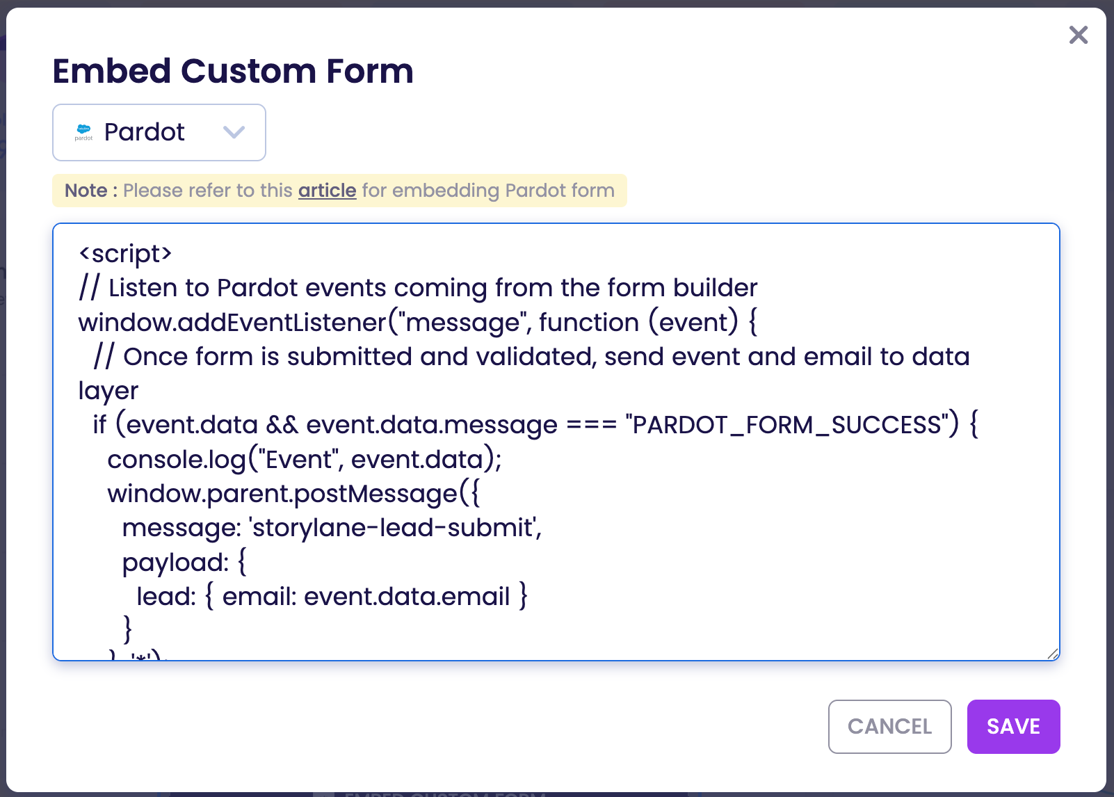 Choose "Pardot" from the dropdown and copy-paste the code from Pardot.