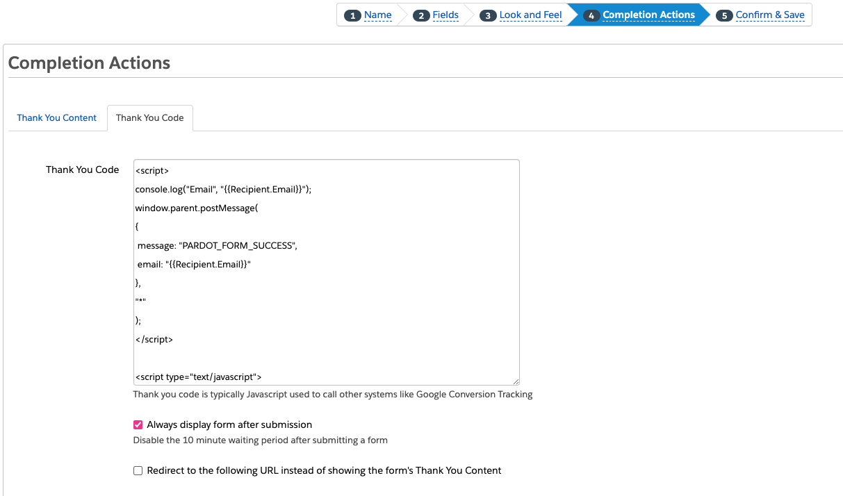 In Pardot, under the "Thank you Code" tab from the "Completion Actions" section, you'll need to add the following code: