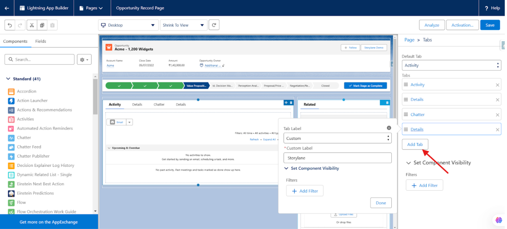 Tab View: Add the Storylane Lightning Web Component (LWC) as a separate tab on the Opportunity record page.