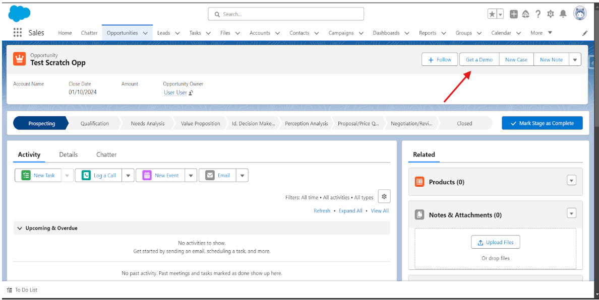Click the “Get a Demo” button on the Opportunity record page.