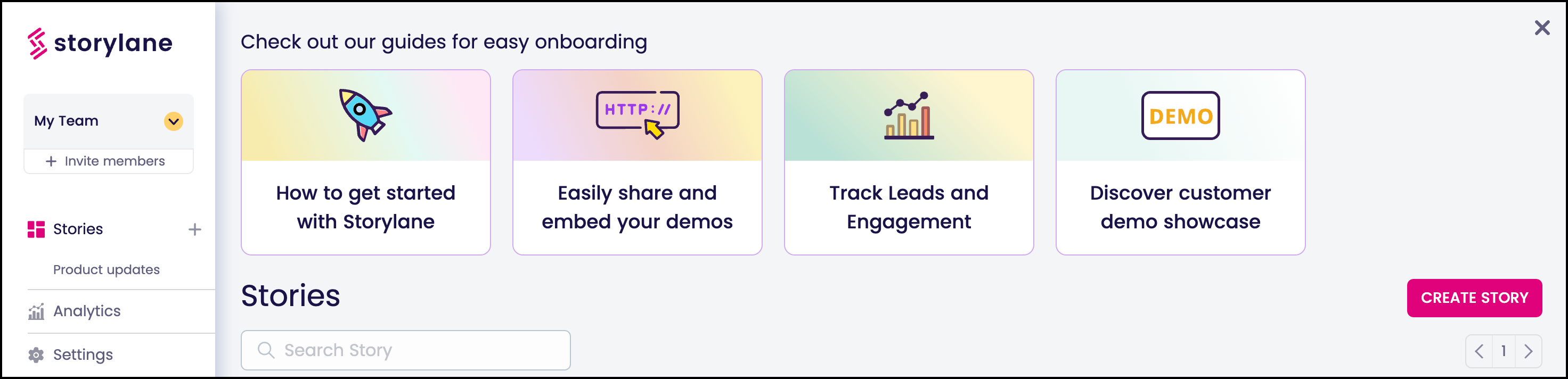 In lieu of this, every new user will now be greeted with a few onboarding guides on the dashboard. These will help first-timers get started in no time and once you feel confident about using Storylane, you can close them for good.