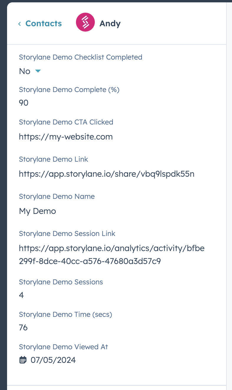 Storylane populates custom fields in HubSpot contacts under the "Storylane" property group. Here's a breakdown: