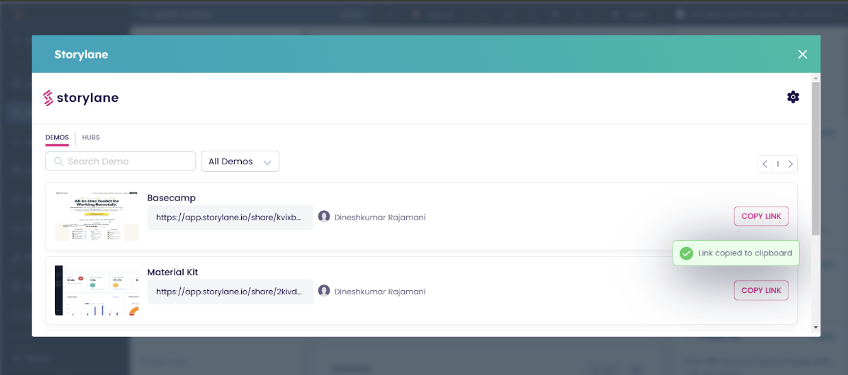 2. Click Copy Link next to the desired demo to copy the tokenized URL to your clipboard.