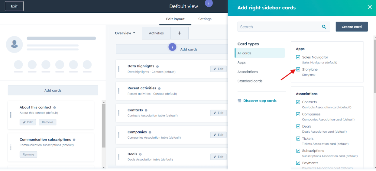 Locate and add the Storylane card to the contact sidebar.