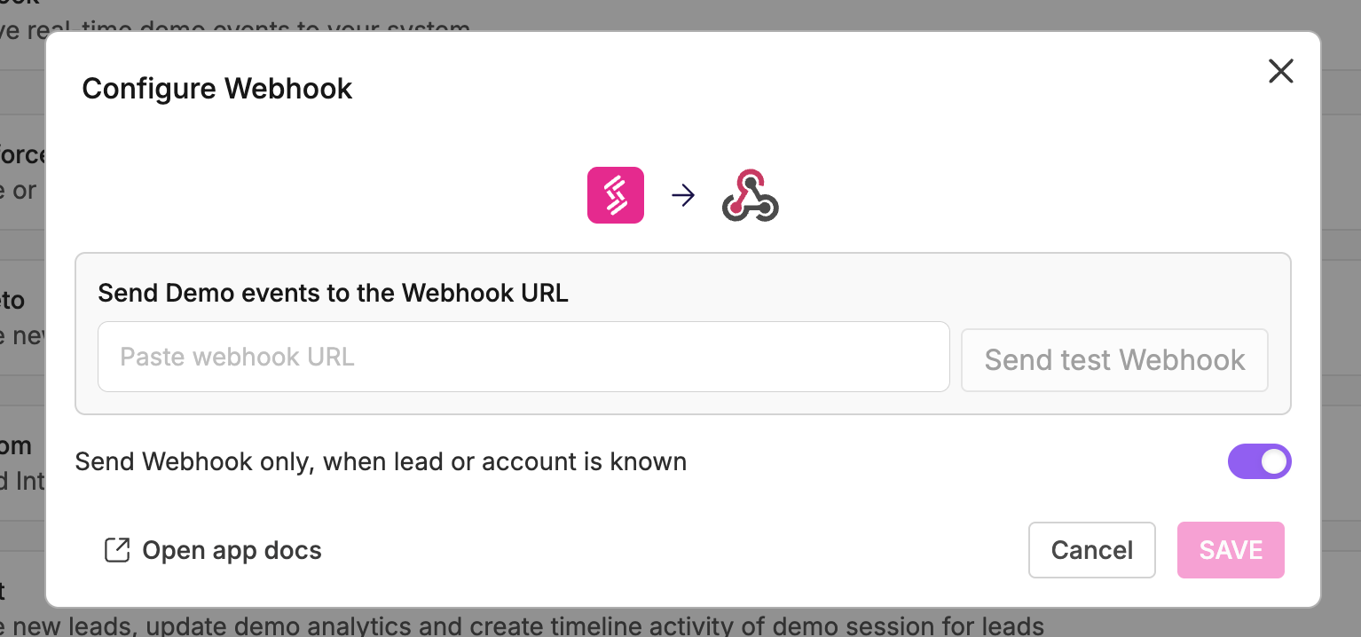 Lastly, decide whether you want to send webhooks for all demo sessions (unknown and known), or only when the lead or account is known.